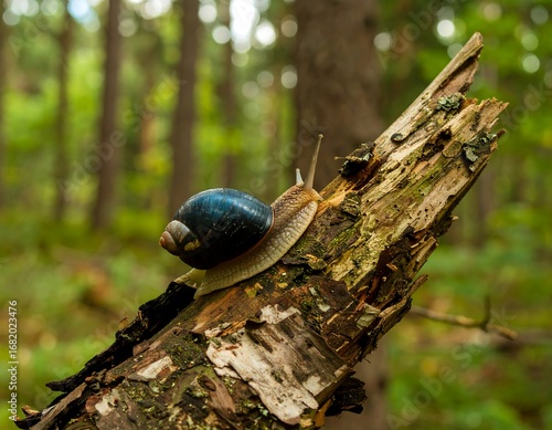 snail, log, forest, nature, wildlife, animal, slow, movement, broken, wood, closeup, environment, summer, green, brown, blue, grey, white, detail, texture, macro, natural, moving, organic, beauty, calm, quiet, peaceful, forest floor, timberland, tracking, crawling, shell