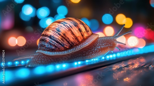 snail, light, night, macro, photo, bokeh, colourful, glowing, shell, slow, motion, wildlife, nature, animal, invertebrate, mollusc, closeup, dark, high-coloured, bright, illumination, blurred, background, abstract, texture, detail, shiny, surface, path, journey, travel, speed, contrast, colours, artistic, creative, beautiful, elegant, unique, garden, isolated, brown, slimy, white, closeup, garden snail, leaf, slug