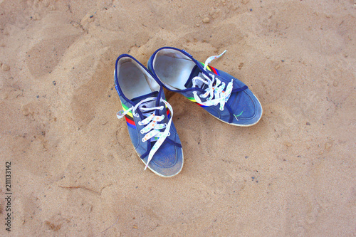 Sneakers on a sandy background. Blue sneakers with untied shoelaces. top view.