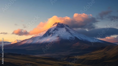 Snow capped mountain with clouds swirling above
