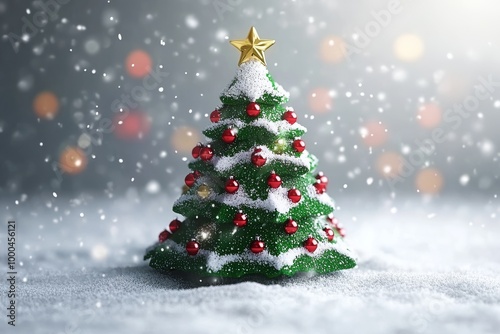 snow-covered, christmas, tree, red, gold, ornament, snowy, field, falling, snow, traditional, holiday, celebration, christmas spirit, winter landscape, festive season, christmas night, christmas lights