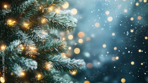 christmas, tree, tree branch, snow, light, winter, festive, holiday, season, celebration, december, sparkle, glow, bokeh, magical, warm, cosy, bright, illuminated, serene, peaceful, joyful, happy, merry, elegant, beautiful, enchanting, twinkling, glistering, ambience, background, scene, image, photo, design, element, decoration, ornament