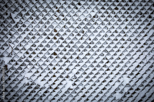 snow, winter, fence, metal, pattern, texture, grid, white, cold, design, geometry, weather, season, nature, steel, wall, urban, structure, protection, netting, mesh, abstract, background, iron, detail, climate, clean, simple, monochrome, surface, line, criss-cross, curve, flurry, contrast, boundary, steelwork, coating, quiet, peace, symmetry, rythm, visual, minimalism