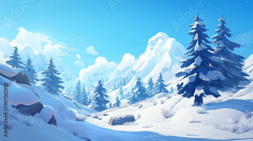 Snow covered mountains and alpine trees under crisp blue sky create serene winter landscape