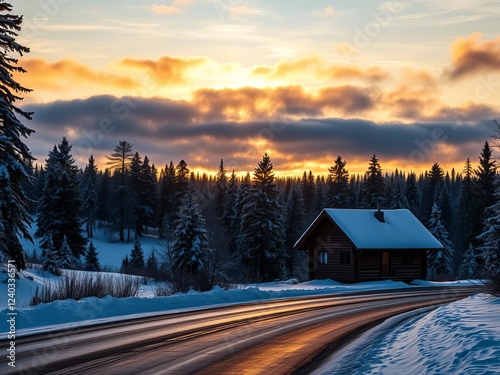 Snow covered pines in a winter wonderland at sunrise with a cabin beside a winding road, golden, tranquil, cabin