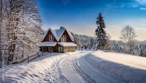 winter, snow, landscape, house, cold, tree, nature, sky, road, mountain, white, forest, season, frost, rural, ice, village, bungalow, christmas, snowy, blue, farm, tree, wood, barn