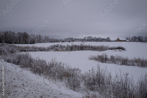 snow covered trees and field in gloomy winter day