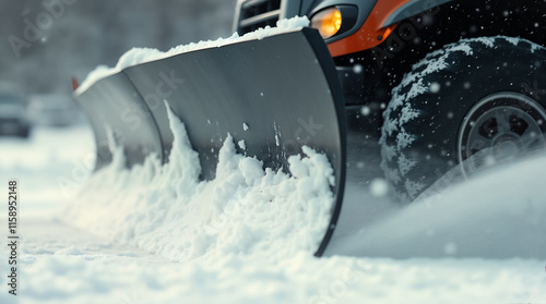 Snow Plow Truck Clearing Road During Winter Storm at Night in Urban Area. Services, safety, municipal works, and seasonal transportation.