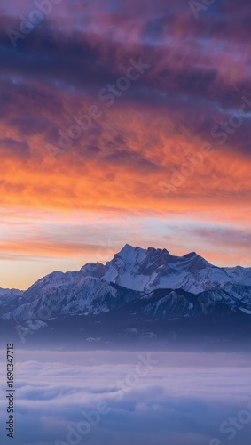 Snow-capped mountains above clouds at sunset with vibrant sky