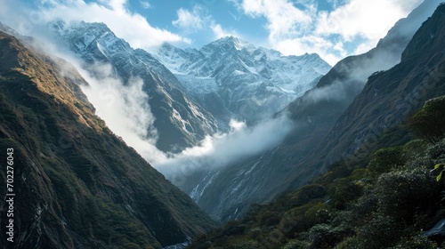 snow-capped peaks embracing the morning mist, creating an ethereal dance of light and shadows on the untouched valley below.