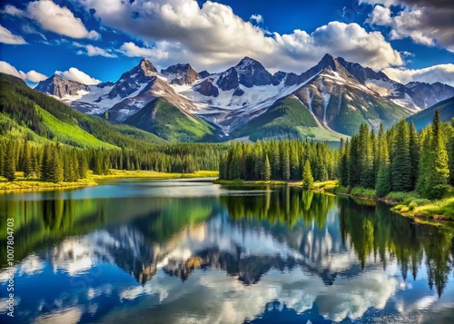 Snow-capped peaks of the Rocky Mountains tower above a serene alpine lake, surrounded by lush green forests and