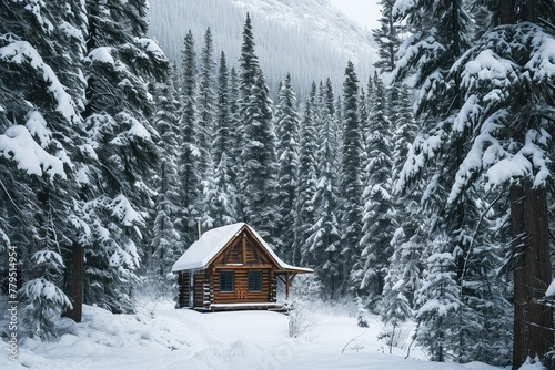 Snow-covered cabin, Tiny cabin surrounded by snow-covered pines in winter, AI generated