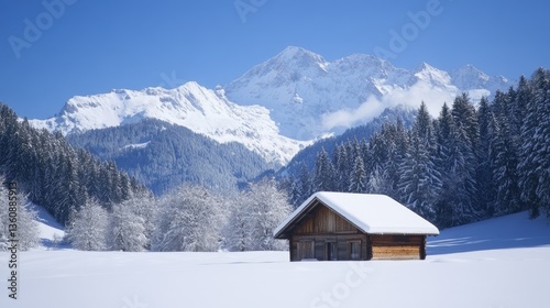 Snow-covered alpine peaks with a wooden lodge nestled among pine trees, representing a serene winter travel destination.