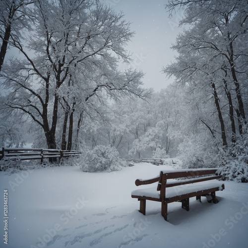 Snow-covered bench in a quiet park, with a blanket of fresh snow on the ground and trees.Abandoned Empty wooden bar counter. Cafe bokeh interior.