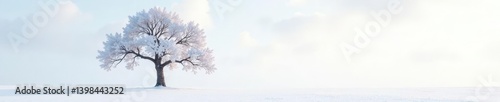 Snow-covered branches of a lone tree on a white background glisten in the morning light, winter, snow