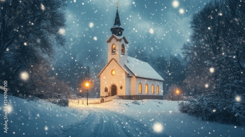 Snow-covered church in winter landscape, concept of peace, faith, and celebration, soft falling snow, warm lights, serene and festive atmosphere.