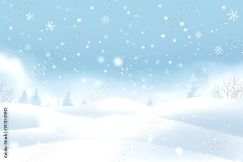 Snow-covered landscape with falling snowflakes. Background winter