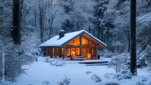 Snow-covered lodge in a forest, large windows, soft glow inside
