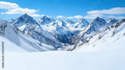 Snow-covered mountain range under a bright blue sky with scattered clouds, creating a stunning winter landscape.