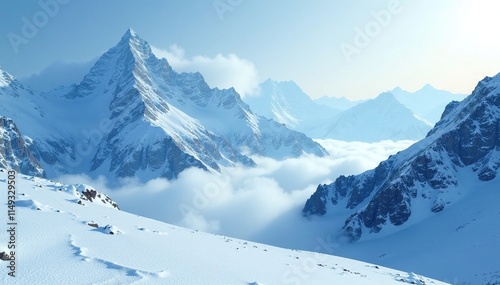 Snow-covered mountains with an abstract blue and white icy atmosphere and misty veil, winter wonderland scenery, snow covered mountains, blue icy hues