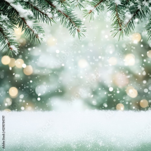 Snow-covered pine branches frame a soft-focus winter scene with bokeh lights creating a magical and serene atmosphere during the holiday season