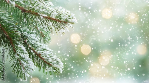 Snow-covered Pine Tree Branches in a Winter Landscape with Soft Bokeh Background and Glistening Snowflakes