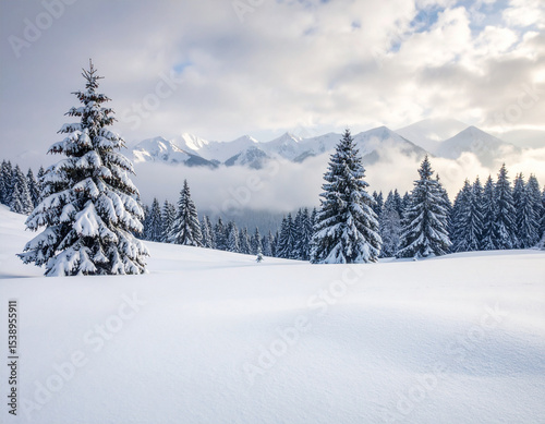 Snow-covered trees stand in a foggy mountain landscape. Heavy snowfall blankets the scenery creating a winter wonderland.