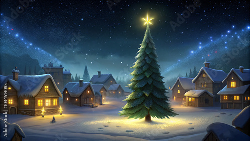 Snow-covered village at night, with glowing lights from windows, a tall Christmas tree in the center of the square, soft snowfall under a starry sky, christmas design background