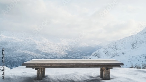 snow, bench, wooden, mountain, landscape, cloudy, sky, copy, space, text, winter, outdoors, nature, frost, cold, serene, peaceful, scenery, tranquil, white, wood, park, freezing, beauty, calm, scenic, view, empty, rural, snowdrift, seasonal, environment, terrain, countryside, natural, arctic, remote, holiday, leisure, relaxation, calmness, isolated, picturesque, fresh, atmospheric, weather, wilderness