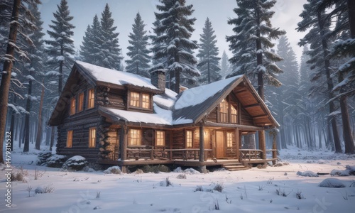 Snow-dusted pines, cozy cabin nestled in snowy woods, gentle snowfall , winter, woods, cold