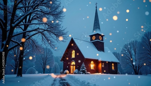 Snowflakes gently fall around a serene church steeple illuminated by soft golden lights, snow, peaceful scene