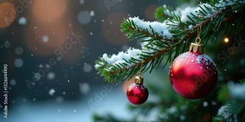 snowflakes gently falling on a spruce branch with ornaments, festive atmosphere, spruce branch