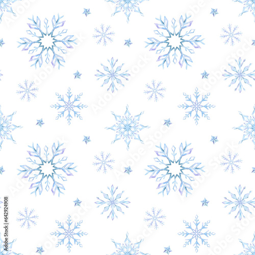 Snowflakes. Watercolor seamless pattern. Decorative winter background with hand drawn snowflakes, snow, stars. For fabric, wrapping paper, scrapbooking, postcards, invitations, cards