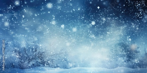 snowing texture of a snowy landscape with a tree in the foreground, surrounded by snow - covered trees and a clear blue sky
