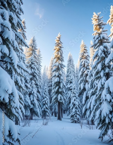 Snow-laden pine trees in a tranquil winter forest, scenic, environment, cold weather