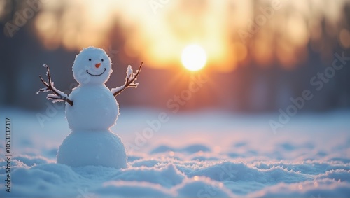 Snowman in a snowy field during sunset, trees in background, warm glow, peaceful winter scene. Generative, AI,