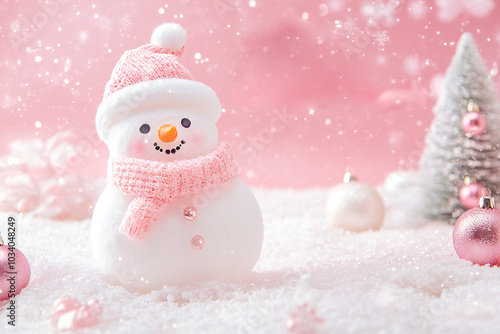 Snowman in pink colors on Christmas card, Merry Christmas and Happy New Year greeting card