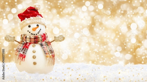snowman, snow, winter, christmas, holiday, festive, celebration, december, gold, gold, background, bokeh, light, sparkle, glistering, magic, whimsical, happy, cheerful, joy, season, greeting, card, banner, copy space, decoration, ornament, cute, traditional, red, white, foulard, hat