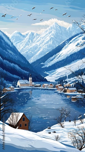 village, alpine, snow, winter, mountain, lake, church, house, tree, sky, bird, cold, glacé, serene, tranquil, peaceful, scenic, picturesque, landscape, nature, beauty, majestic, wilderness, holiday, travel, vacation, get-away, christmas, season, ice, water, hill, vale, remote, quiet, stillness, calm, snowy, frost, atmosphere, breathtaking, panoramic