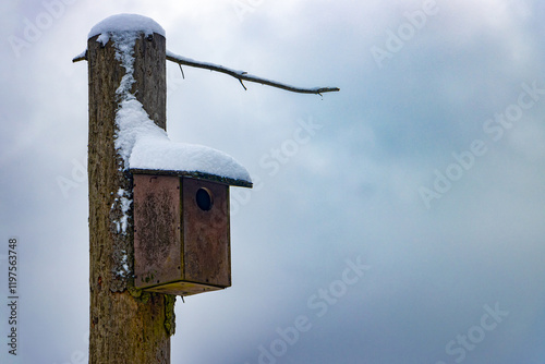 birdhouse, box, snow, winter, tree, feeding, pole, pillar, mast, meadow, storm, blizzard, shelter, snow-covered, ornithology, blue, tree, roof, rural, eat, hanging, snowy, snowfall, covered, dramatic, dark, cloudy, sky, nature, bird, cold, house, wooden, forest, park, animal, wildlife, wood, white, outdoors, garden, season, frost, natural, feeder, bird, landscape, food, birdhouse