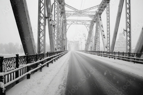bridge, road, snow, winter, snowy, landscape, cold, season, transportation, infrastructure, travel, journey, pathway, architecture, structure, steel, metal, construction, engineering, design, monochrome, black-and-white, cold weather, frosty, icy, serene, quiet, peaceful, calm, stillness, solitude, empty, desolate, bleak, stark, harsh, raw, weather, climate, perspective, line, geometric, pattern, urban, rural, scenic