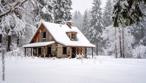 Snowy cabin in the forest