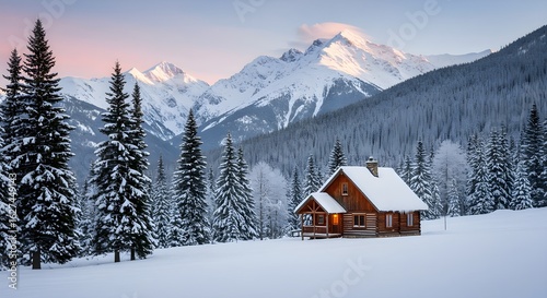 cabin, winter, mountain, snow, forest, landscape, snow-covered, nature, wood, house, tree, pine, mountain, scenery, beauty, peace, calmness, wooden, exterior, travel, vacation, winter scene, winter landscape, sunrise, sunset, calm, idylli, peaceful, isolated
