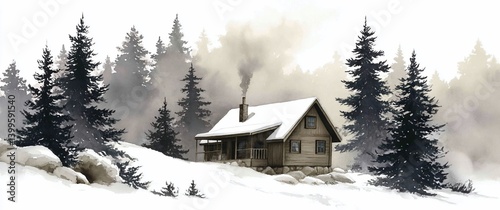 Snowy cabin, smoke rising, nestled between tall pines, tranquil winter scene