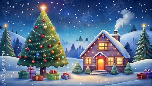 christmas, tree, present, snow, light, house, winter, holiday, cosy, decoration, gift, festive, cabin, snow-covered, christmas eve, celebration, winter scene, magical, peaceful, star, holiday season, bungalow, traditional, serene, warm, night, snowy, outdoors, chimney, christmas spirit