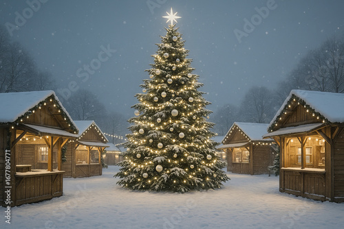 Snowy christmas square with decorated tree and festive market stalls at night. concept of holiday celebration, winter wonderland, festive atmosphere