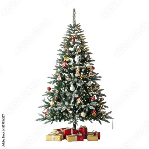 Snowy Christmas Tree with Gifts Isolated on Transparent Background (PNG)