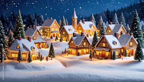Snowy Christmas Village Night Scene with Winter Wonderland.