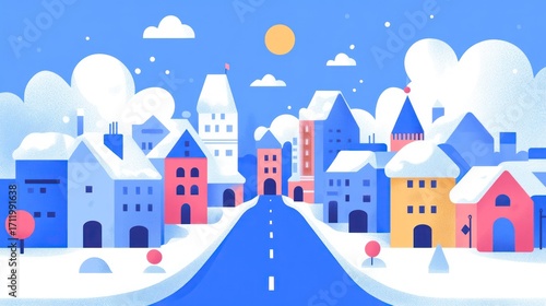 winter, snow, village, town, house, street, road, building, landscape, scene, city landscape, christmas, holiday, season, cold, frosty, snowy, architecture, urban, scenic, blue, white, yellow, red, illustration, graphic, design, art, colourful, cute, cartoon, style, background, image, vector, peaceful, tranquil, quiet, calm, serene, happy, joy, fun, festive, celebration, magical, whimsical, adorable, charming