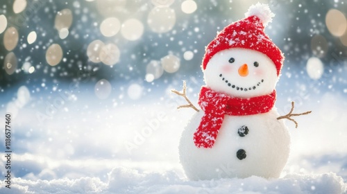 Snowy Day Delight: A cheerful snowman, adorned in a red hat and scarf, stands proudly in a winter wonderland, snowflakes gently falling around it. The scene is filled with warmth and festive cheer.